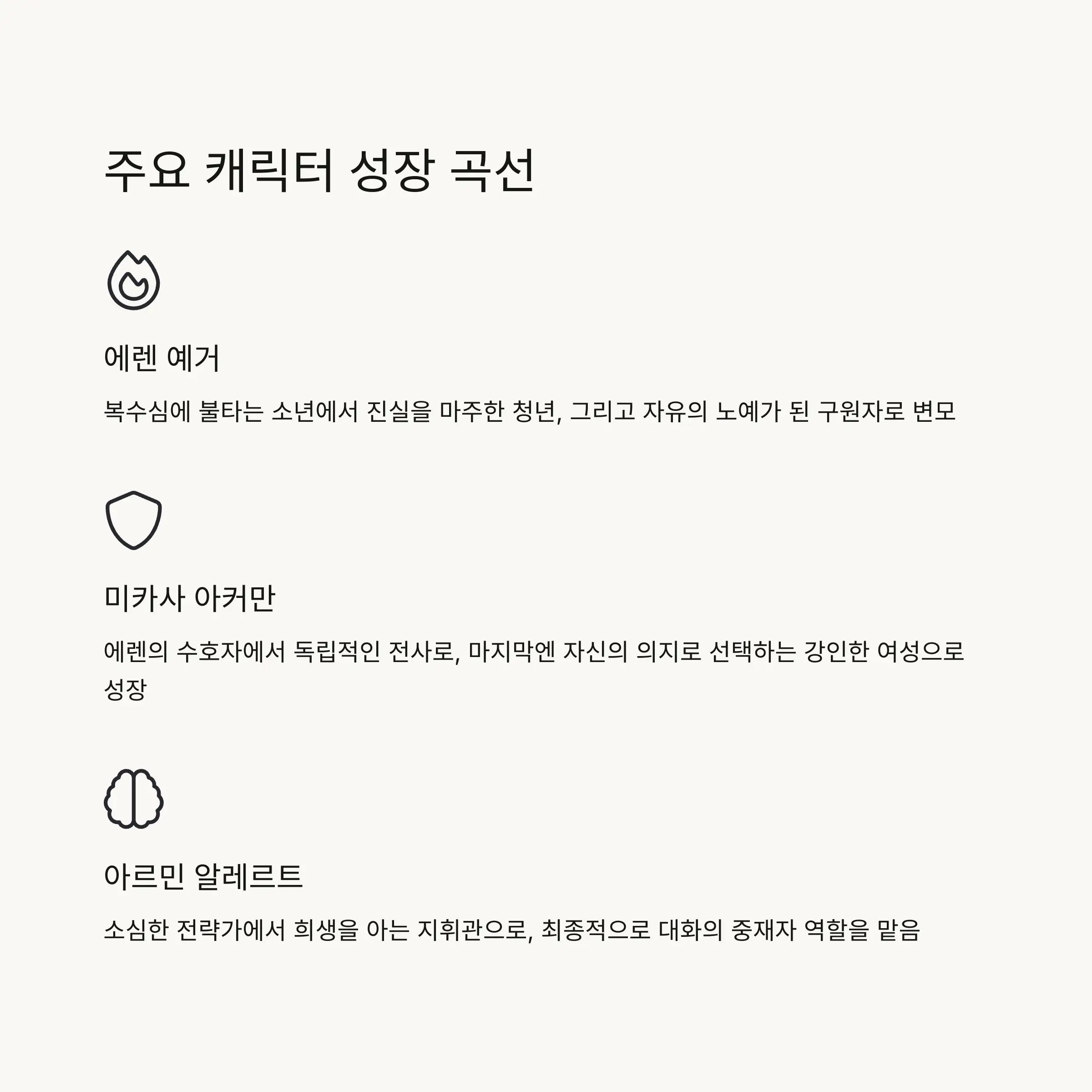 | 에렌 | 복수심에 불타는 소년 | 진실을 마주한 청년 | 악마가 된 구원자 |