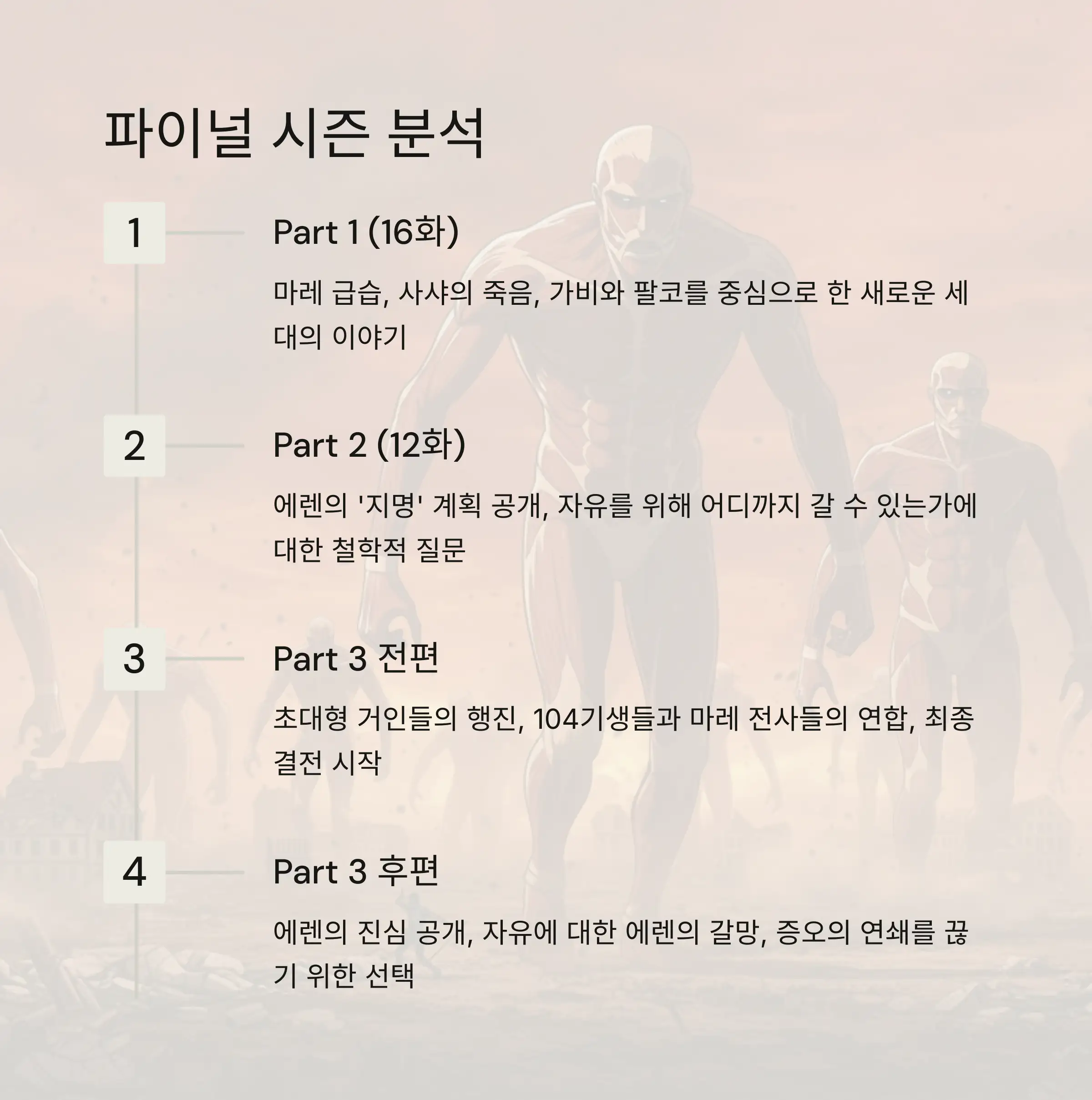 | Part 1 (1~16화) | 마레 급습, 사샤의 죽음 | 가비, 팔코, 라이너 | 에렌 vs 전퇴의 거인 |