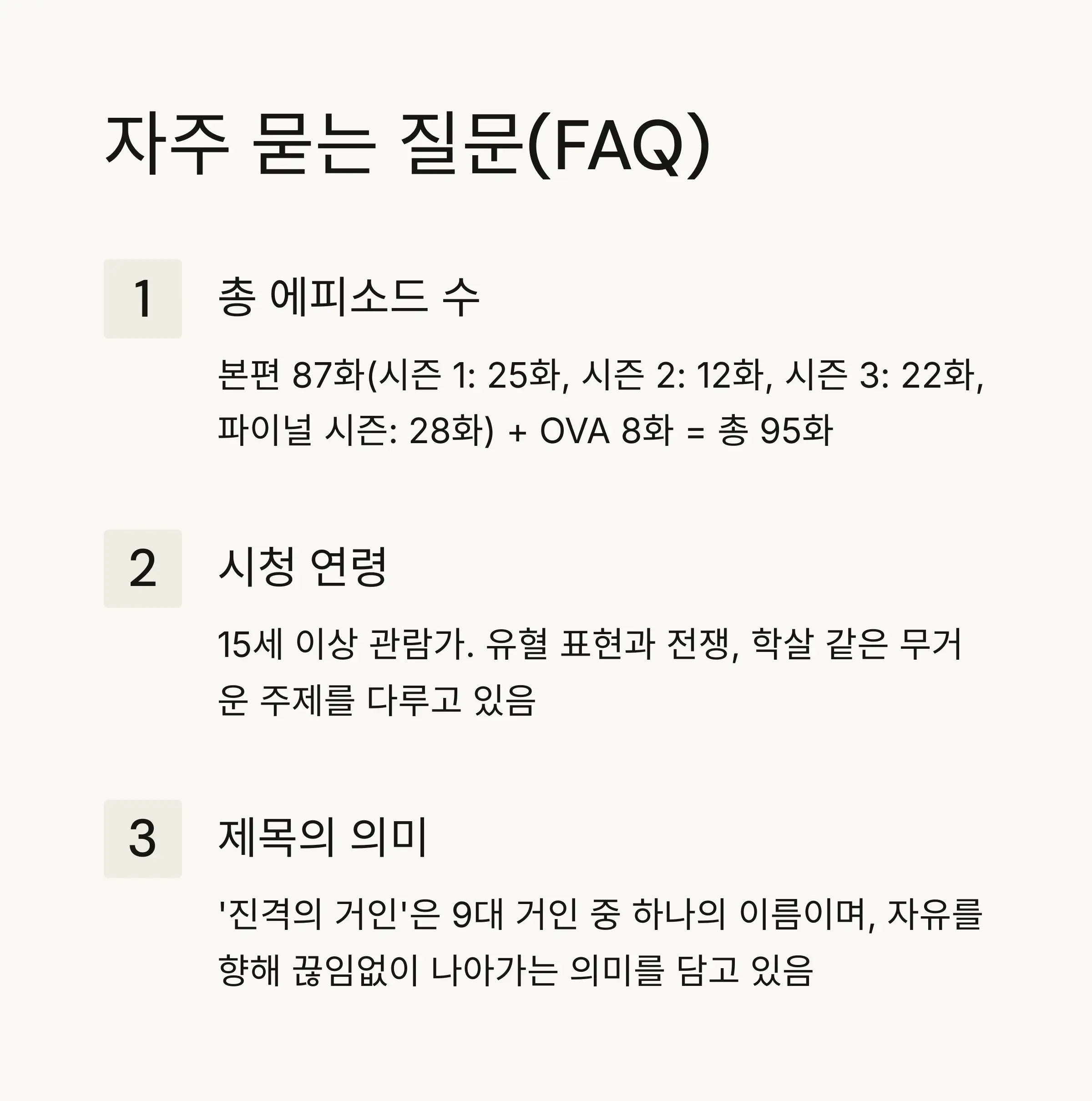 A1. 진격의 거인 애니메이션은 총 87화로 구성되어 있어요! 시즌 1이 25화, 시즌 2가 12화, 시즌 3가 22화(Part 1: 12화, Part 2: 10화), 파이널 시즌이 28화(Part 1: 16화, Part 2: 12화)이고, Part 3는 전편과 후편 각 1시간 분량의 스페셜 에피소드로 방영되었답니다. OVA까지 포함하면 8화가 추가되어 총 95화가 되죠!